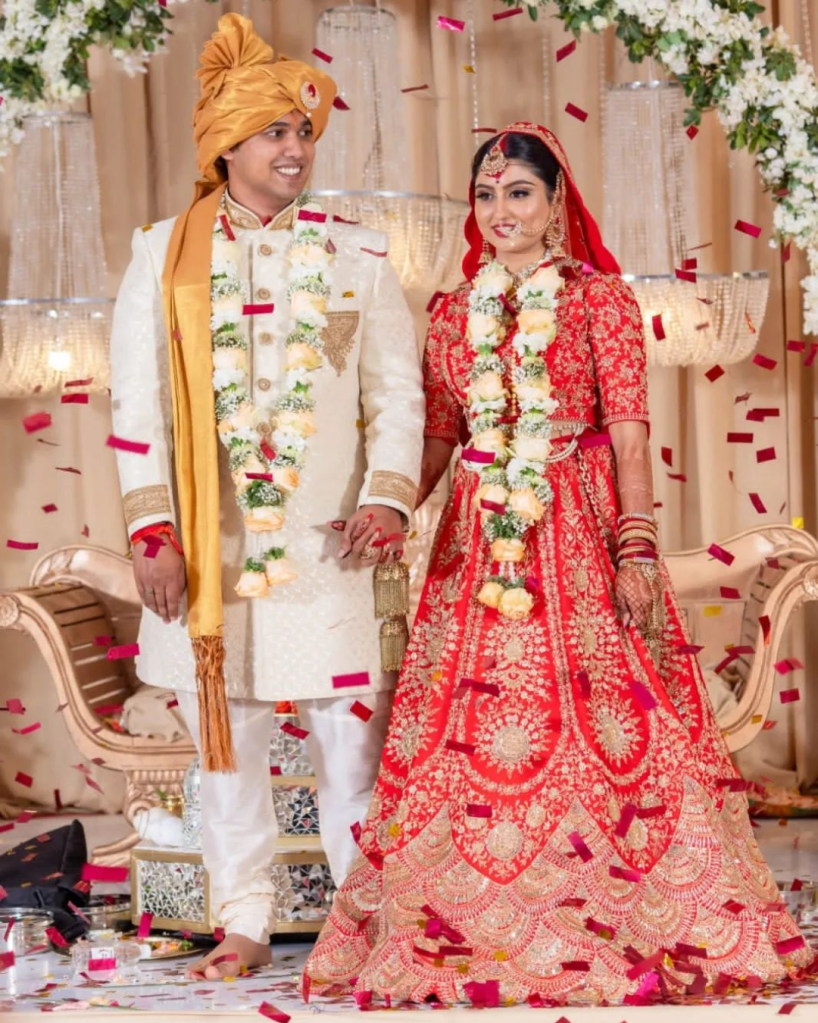 The stunning Suraksha graced her marriage ceremony to Phavan in a breathtakingly beautiful tangerine lehenga, perfectly complementing the neutral shades of elegance in the decor. The celebration was nothing short of magical, with every detail thoughtfully curated to create an unforgettable day.